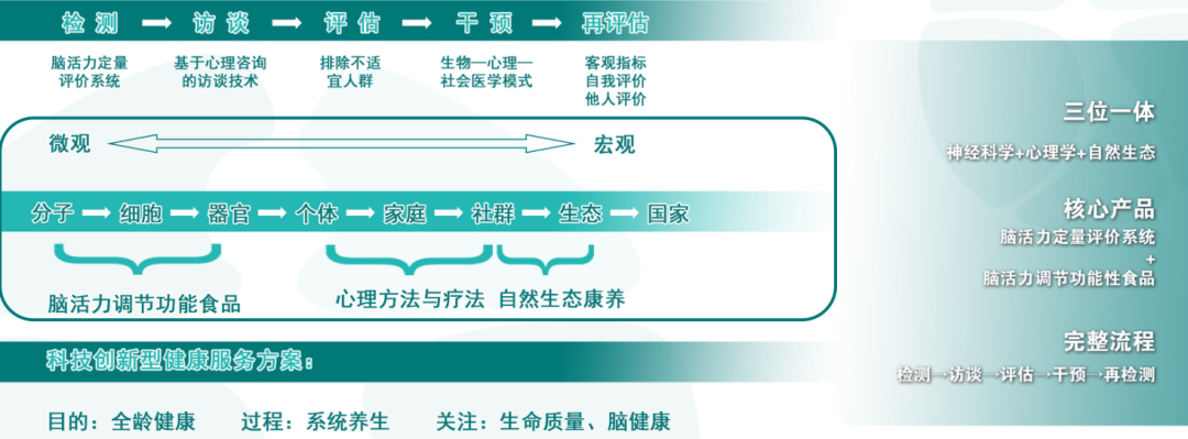 项目立足国家大健康战略,聚焦前沿神经科学前沿研究成果,结合神经科学—心理学—自然生态多学科康养模式,围绕两项核心技术产品:脑活力定量评价系统、脑活力调节食药产品,通过检测→访谈→评估→干预→再评估的完整流程,实现为目标人群定制个性化脑康养方案。